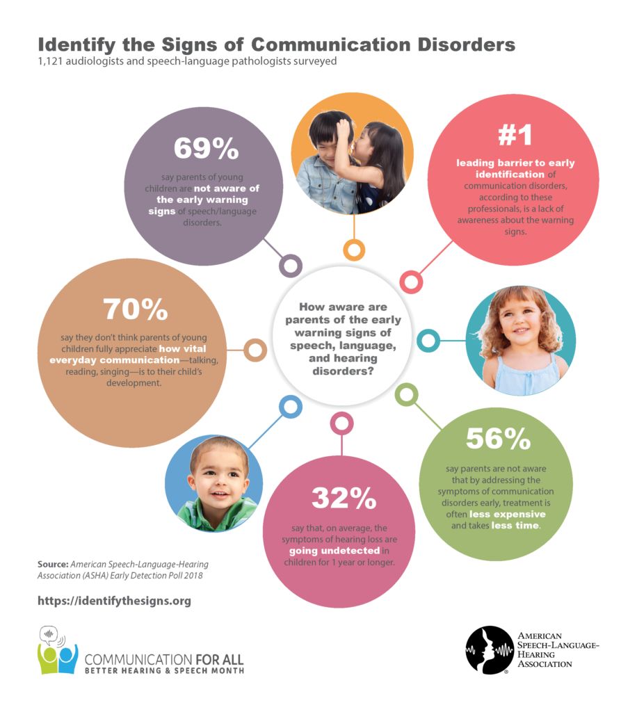 The American Speech-Language-Hearing Association says that 69% of ASHA members report parents of young children are not aware of early warning signs of speech/language disorders. Speech, language, and hearing disorders are some of the most common childhood disabilities. These communication delays and disorders are often highly treatable, and the earlier we intervene the better. Better Hearing and Speech Month is a great time to remind parents to seek guidance as soon as they suspect something. Speech-Language Pathologists are great at evaluating children and will help parents determine if their child is developing normally or needs some support. If support is delayed, future success in writing, academics, and social interactions could be affected.